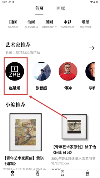 1、在首页点击艺术家(例如赵慧斌)的头像,即可进入该艺术家的个人主页,进而查看其作品列表。