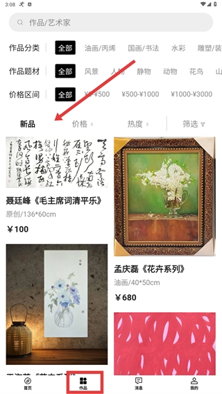 4、返回首页后,点击【作品】按钮,可通过分类(油画、国画等)、价格区间筛选作品,精准查找需求内容。