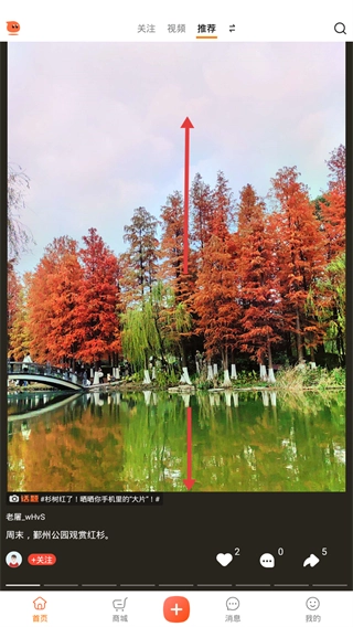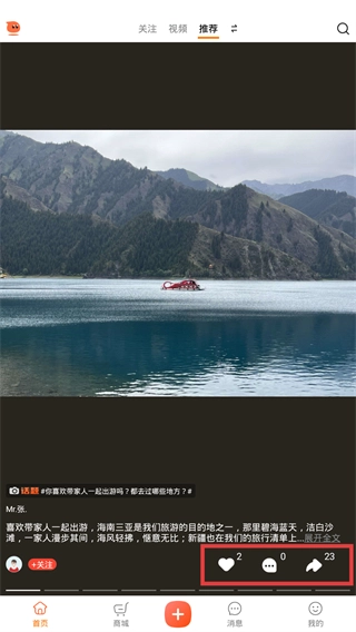 2、在首页“推荐”板块,可查看内容动态,通过底部按钮进行互动, 点赞、评论、评论区分享。