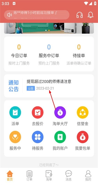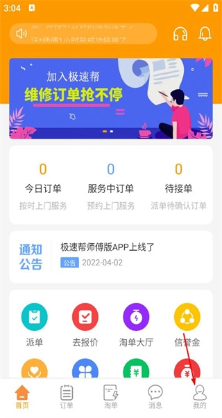 打开软件后,首页展示着今日订单等数据以及派单去报价等功能选项,点击“我的”按钮即可进入对应的个人中心页面。