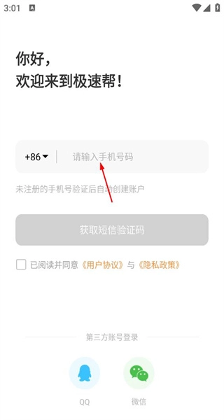 3、进入登录页面,看到手机号输入框及QQ微信登录选项,可填写信息完成账号的登录操作。