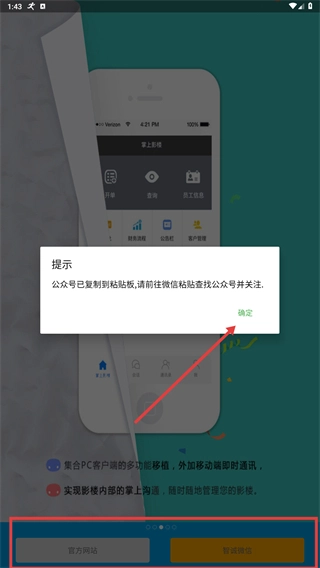 2、点击【智诚微信】按钮,触发公众号复制提示,前往微信粘贴公众号名称,搜索并关注,完成关联操作,获取相关服务。