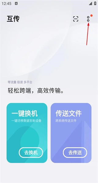 打开软件进入主界面后,界面会显示“轻松跨端高效传输”的提示,且该提示的指引指向右上角的三点图标。
