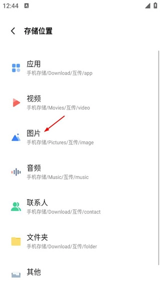 4、进入存储位置页面,页面列出应用视频图片等分类,各分类标注对应存储路径,指引指向图片分类选项。