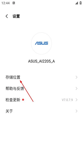 3、进入互传的设置页面,页面显示设备标识,设有存储位置帮助与反馈等选项,指引指向存储位置选项。