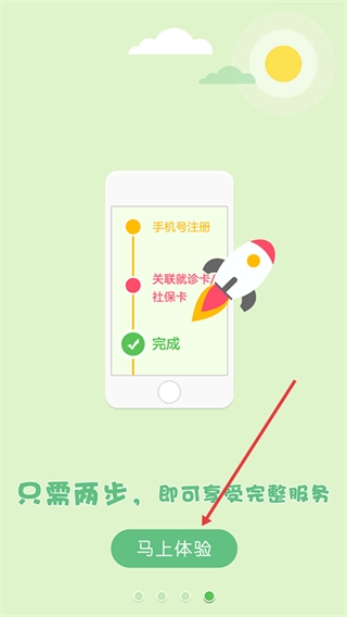 4、点击【马上体验】按钮,按流程完成手机号注册、关联就诊卡/社保卡,即可使用完整服务。