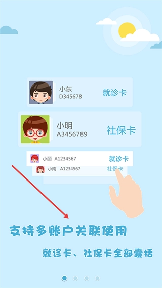 1、此功能支持多账户关联,能够绑定就诊卡、社保卡等各类凭证,从而实现以多种身份使用医疗服务。