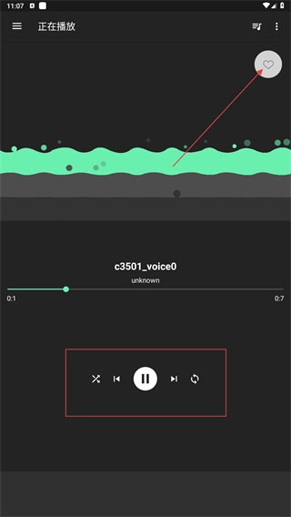 2、进入播放界面,通过中间的控制栏(暂停/切曲等按钮),操控曲目播放状态,也可点击爱心收藏该曲目。
