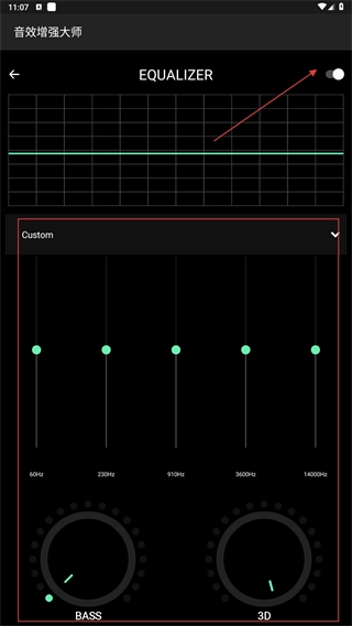 4、在均衡器界面,开启功能后,拖动不同频段滑块,或调节【BASS】【3D】旋钮,优化音频播放效果。