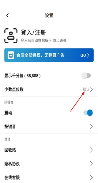 打开软件后进入设置页面,该页面包含登录注册会员等选项,接着选择小数点位数选项并进入对应的页面。