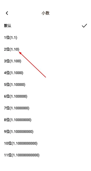 2、进入小数点位数设置页面,展示默认1位至11位等选项,选择对应位数选项,可调整计算器运算结果的小数显示位数。