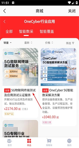 4、进入智能能采页面,展示5G物联网等服务及方案,标注对应价格与销量,查看产品详情。