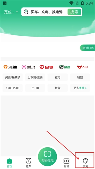 2、在应用首页,点击底部导航栏的【我的】选项,可进入个人中心页面,首页还提供选车、扫码充电等功能。
