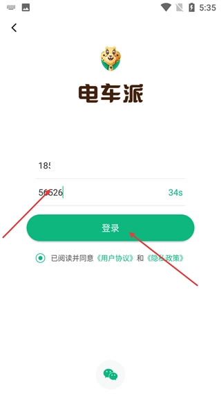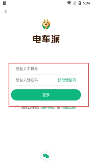 3、在【电车派】登录界面,输入【手机号】、获取并填写【验证码】,勾选协议后点击【登录】按钮准备登录。