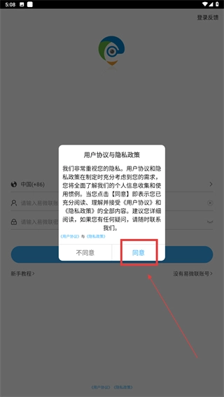 1、仔细阅读《用户协议》和《隐私政策》,确认无误后点击【同意】按钮,即可进入易微联的登录环节。
