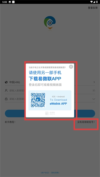 3、若需观看视频画面,点击【没有易微联账号】,按提示用另一部手机扫码易微联,登录后即可查看。