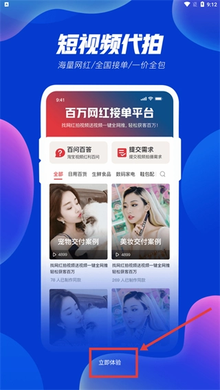 2、在短视频代拍推广页,点击【立即体验】,进入应用主流程。