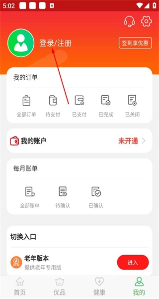 2、进入个人中心页面,呈现登录注册按钮及订单账户等功能,选择登录注册按钮,进入登录界面。