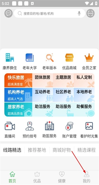 打开软件后,首页设有康养、换住、老年大学等功能板块,点击“我的”选项,即可进入个人中心页面。
