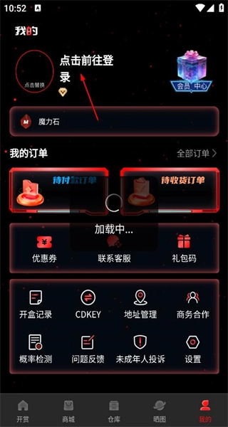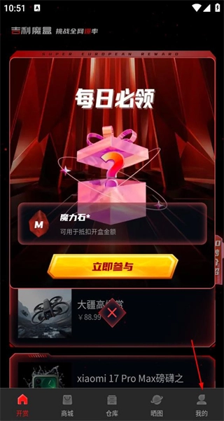 1、启动软件后,首页设有每日必领活动和魔力石奖励,点击底部的“我的”选项,即可进入个人中心页面。