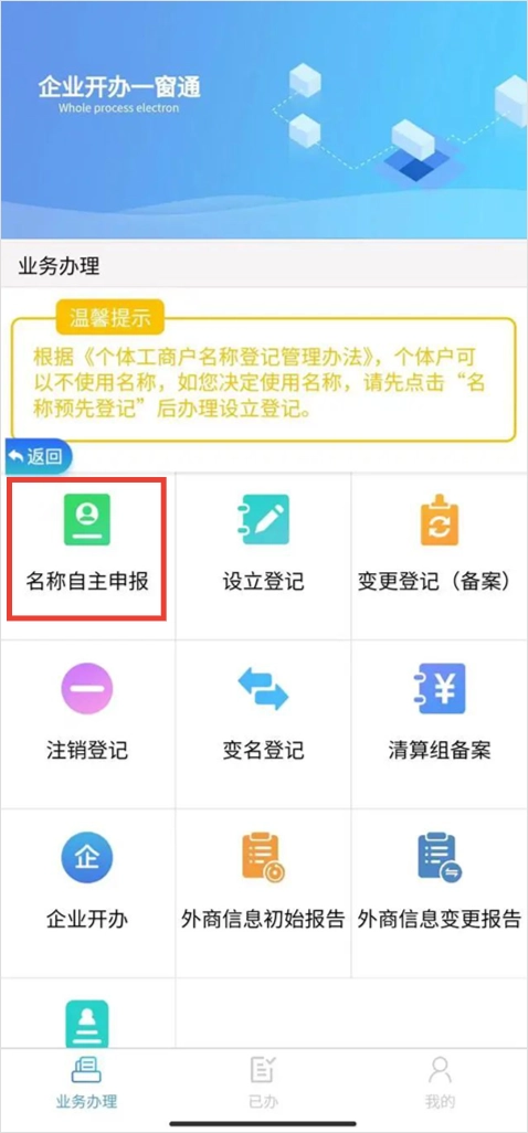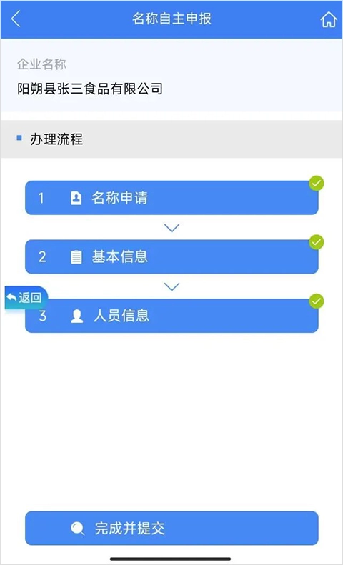 3、点击“名称自主申报”选项,按照要求填写完相关信息后,点击“完成并提交”按钮。
