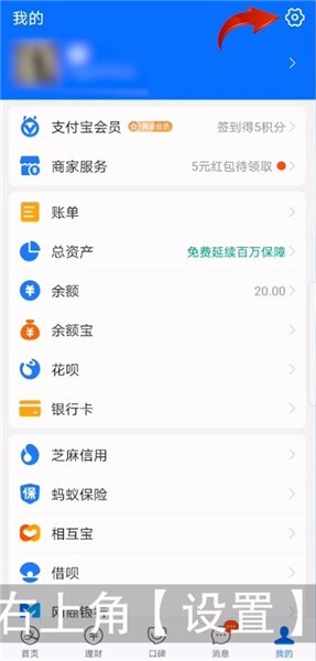 打开【支付宝】客户端,然后点击右下角【我的】,点击右上角【设置】图标,