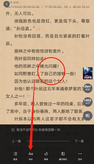 3、进入阅读模式后,轻触屏幕中央,唤出设置菜单,点击“Aa样式”选项;