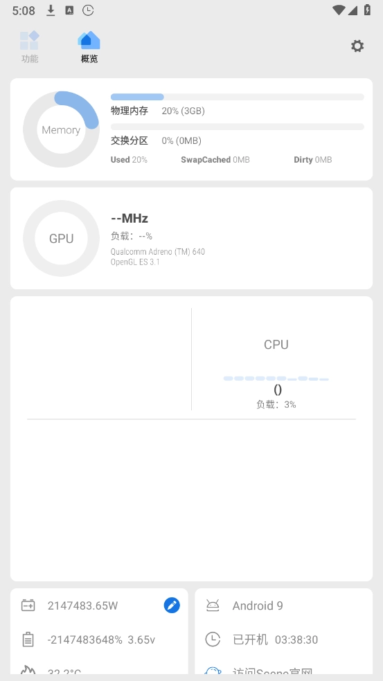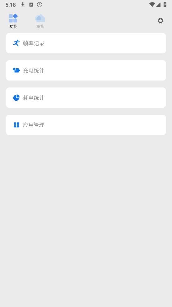 3、点击左上角的“功能”,提供了帧率记录、充电统计、耗电统计等功能。