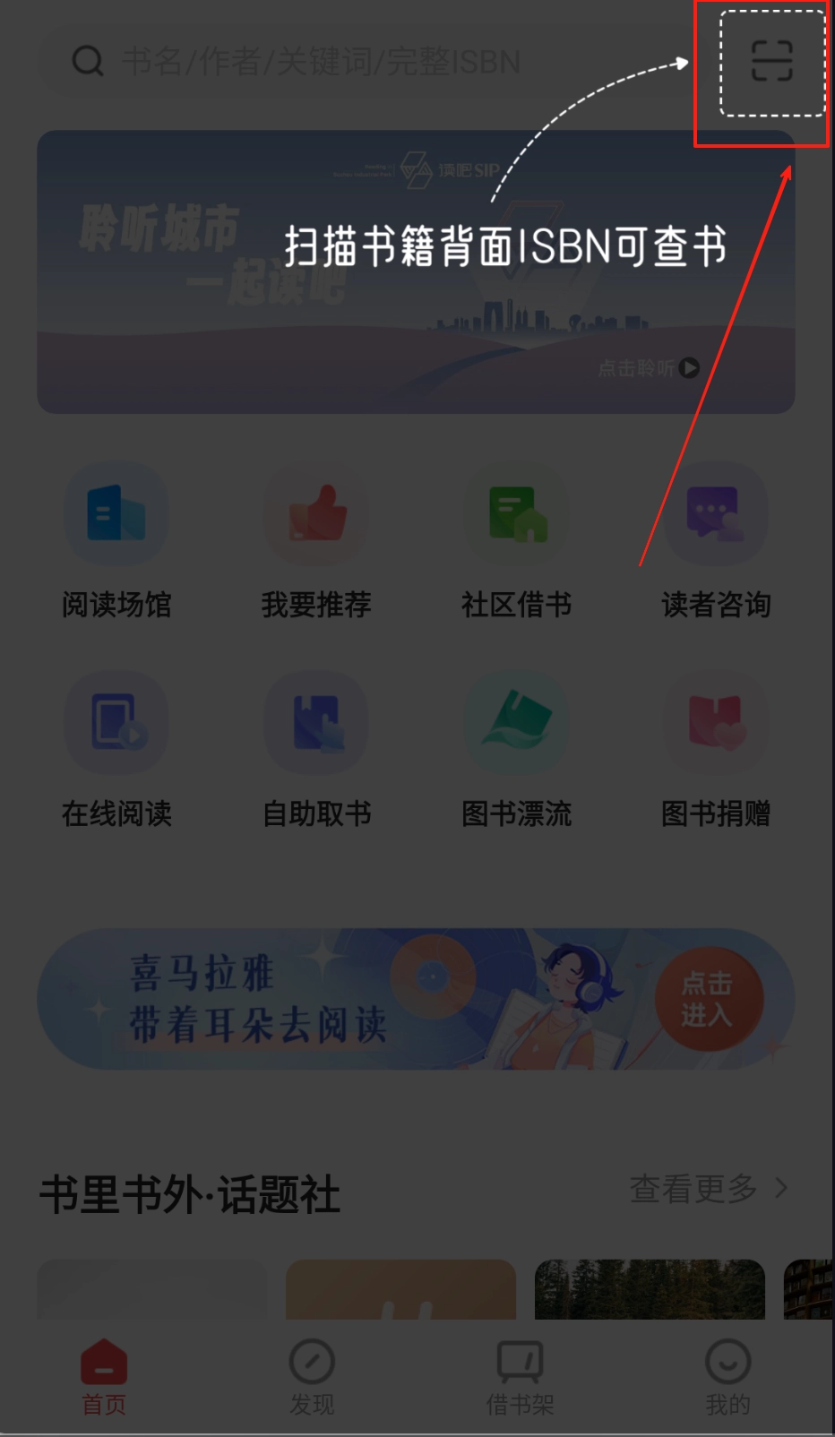 2、首页中部有“在线阅读”“图书漂流”八个功能按钮,点击“喜马拉雅”能听书,红色框里的“常见问题解答”记得看看。