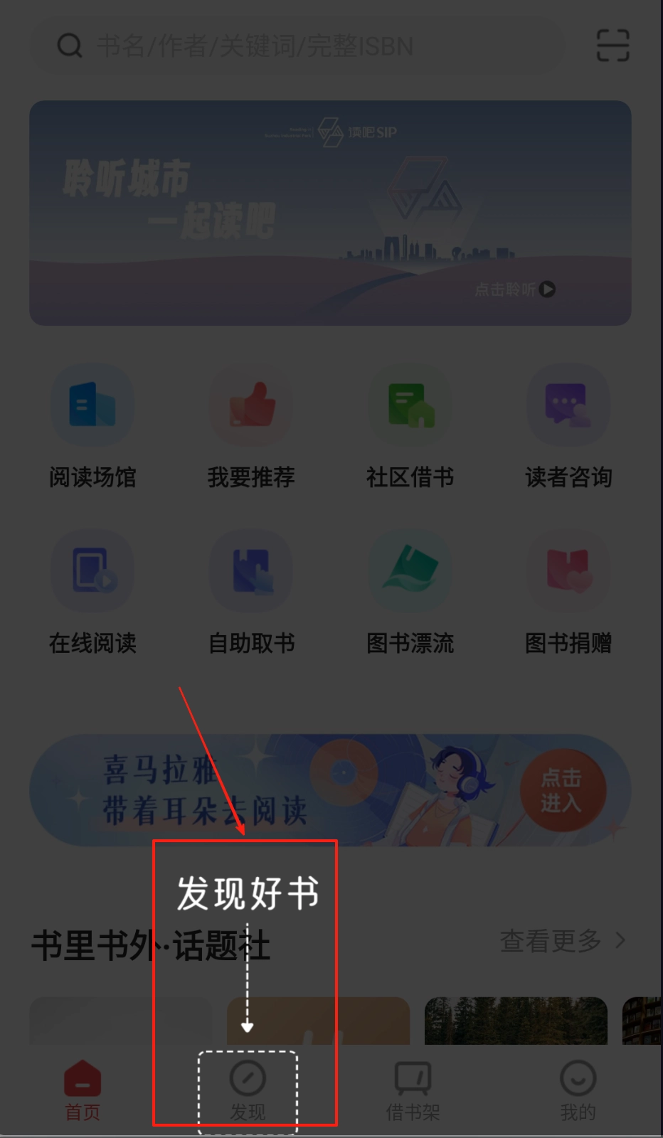 3、底部导航栏切换“发现”页能找到读书活动。