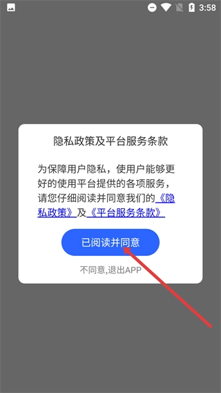 1、打开“福棠医生”应用后,会弹出“隐私政策及平台服务条款”的弹窗,点击【已阅读并同意】按钮,即可进入应用的登录界面。