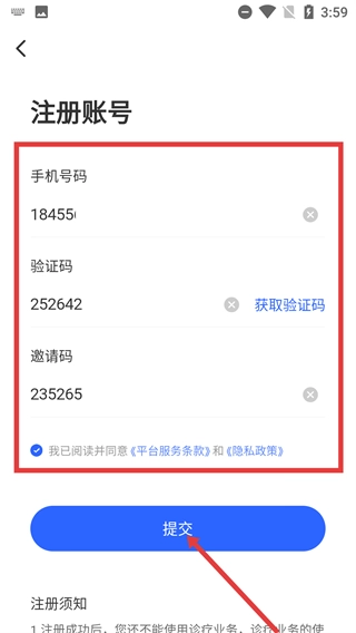 3、在注册账号页面,依次填写手机号码、获取并输入验证码、填写邀请码,点击【提交】按钮,完成账号注册操作。