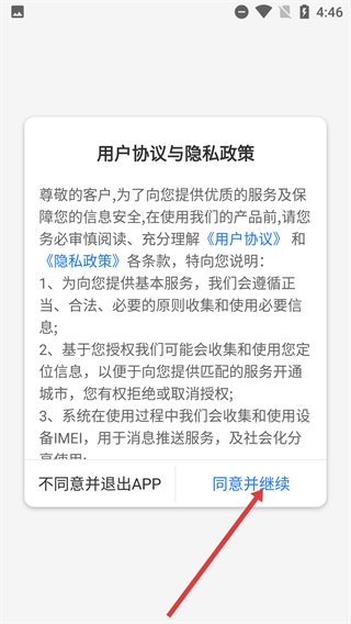 应用启动后,会进入用户协议与隐私政策界面,你需要阅读《用户协议》和《隐私政策》里的相关条款,之后点击【同意并继续】按钮,就能进入应用主界面了。
