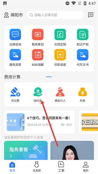 2、进入应用主界面后,在“费用计算”板块中,点击【违约金】功能选项,进入违约金的计算操作页面。