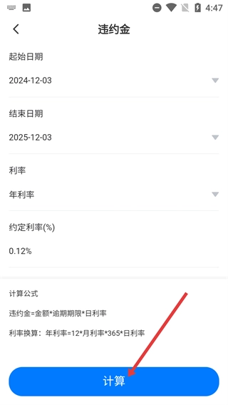 3、在违约金计算页面内,确认或设置起始日期、结束日期、利率类型及约定利率等信息后,点击底部的【计算】按钮,执行违约金计算操作。