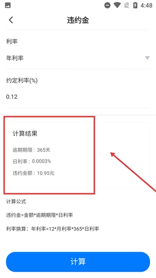 4、完成计算操作后,页面会展示出违约金的计算结果,包含逾期期限、日利率、违约金额等信息,可直接查看该结果。