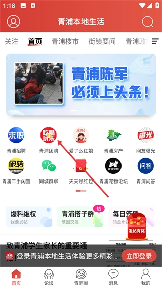 1、打开“青浦本地生活”首页后,点击【青浦团购】的功能入口,即可进入本地生活的服务页面。