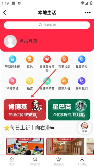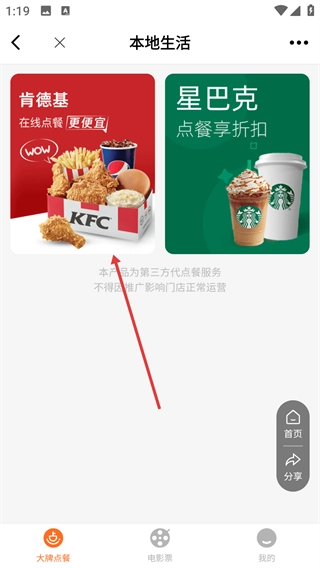 2、在本地生活页面,找到【肯德基】的在线点餐入口,点击进入对应的点餐页面。