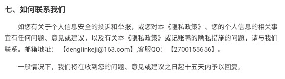 如您有关于个人信息安全的投诉和举报,或您对本《隐私政策》、您的个人信息的相关事宜有任何问题、意见或建议,以及有关本《隐私政策》或记账鸭的隐私措施的问题,请与我们联系。邮箱地址:【denglinkeji@163.com】,客服QQ:【2700155656】。