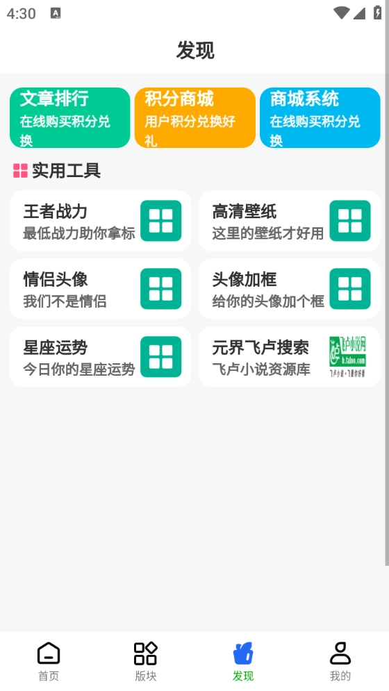 5、“发现”页面,主要是很多实用工具,高清壁纸、网址战力、星座运势等等,直接点开就可以使用。