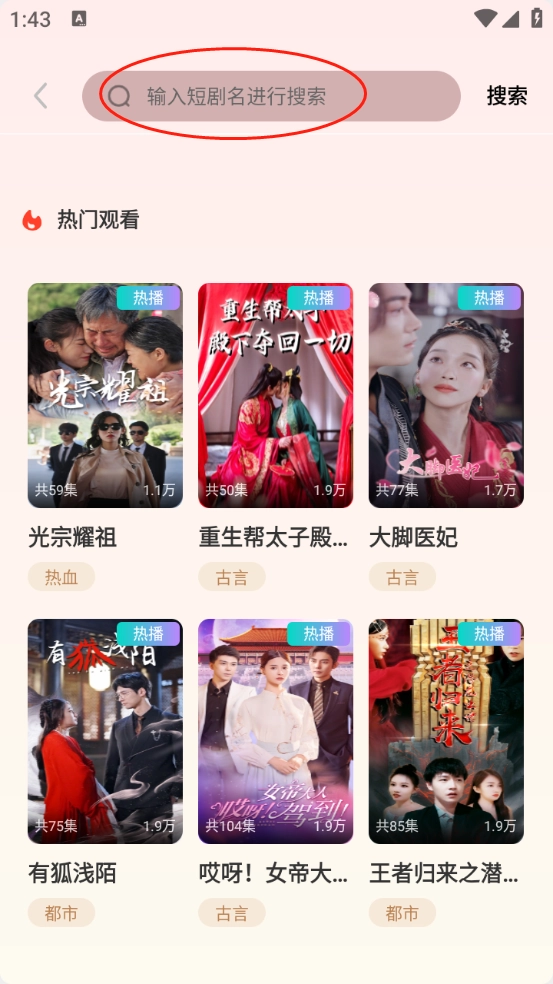 2、剧场页面有很多的短剧类型,包括都市、热血以及玄幻、古言等等。