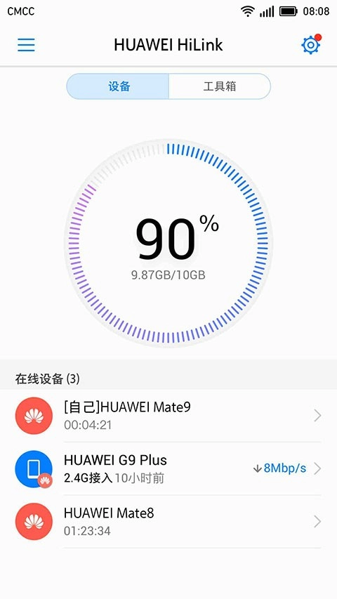 4、当终端设备使用移动无线网时,能看到当前的速率