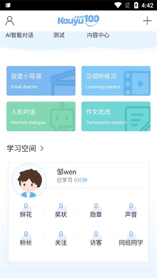1、首先我们打开口语100的最新版本,接着向下滑动页面进入“学习空间”板块。