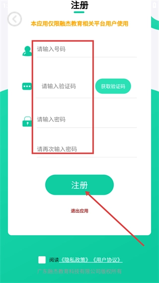 2、在注册页面依次填写【请输入号码】【请输入验证码】【请输入密码】【请再次输入密码】,点击【注册】完成账号创建。