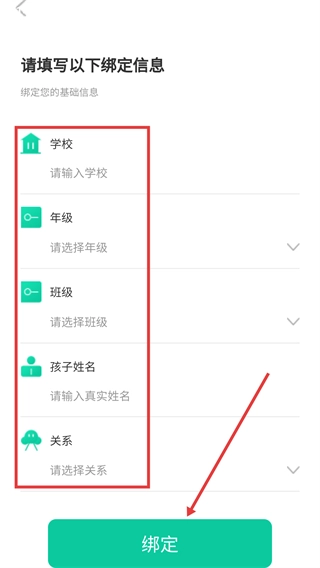 4、在绑定信息页面填写【学校】【年级】【班级】【孩子姓名】【关系】,点击【绑定】完成信息关联。