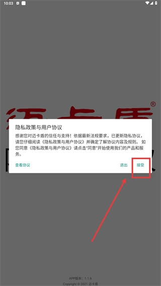 1、找到“隐私政策与用户协议”,点击【接受】按钮,确认同意相关协议后即可进入应用主界面。