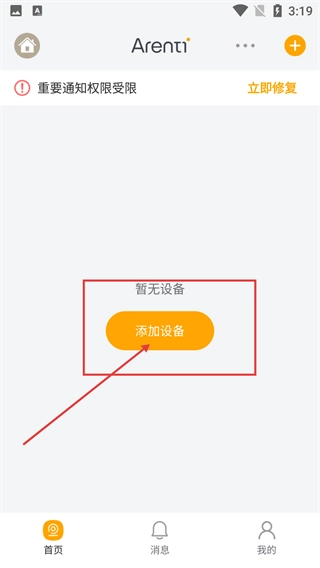 1、进入Arenti首页后,若看到显示【暂无设备】,请点击【添加设备】;另外,若出现【重要通知权限受限】的提示,可根据需要选择【立即修复】。
