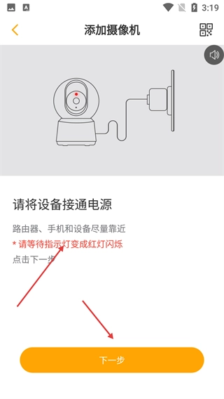 3、在【添加摄像机】页面,先将设备接通电源,待指示灯变成红灯闪烁后,点击【下一步】继续添加流程。