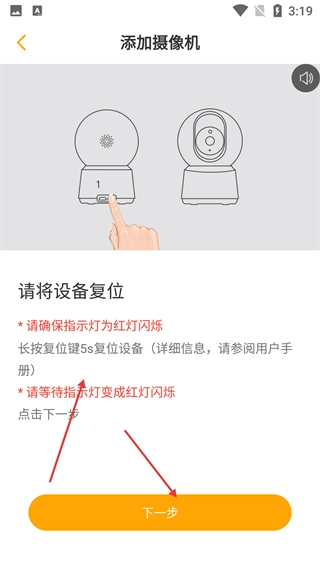 4、在【添加摄像机】的复位步骤中,长按设备复位键5秒,确保指示灯为红灯闪烁后,点击【下一步】推进操作。