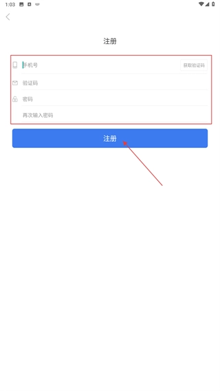 4、若暂无账号,在登录页点击“马上注册”,填写手机号、验证码及密码后,点击【注册】按钮完成账号注册。